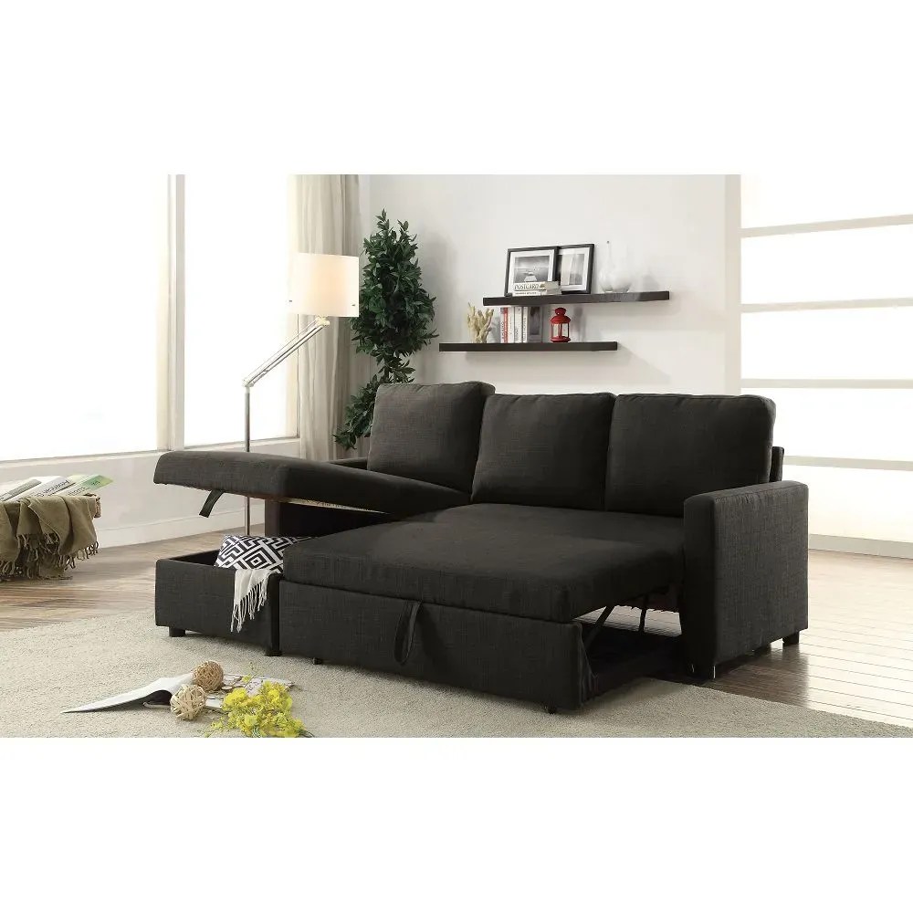 Upgrade your living room with the ACME Hiltons Sectional Sofa with Sleeper in Charcoal Linen 52300. This contemporary piece is not only stylish but also functional. Upholstered in black linen and filled with full foam cushions, it provides additional comfort while being inviting. With its pull-out sleeper and storage, it is perfect for accommodating guests and storing extra items.